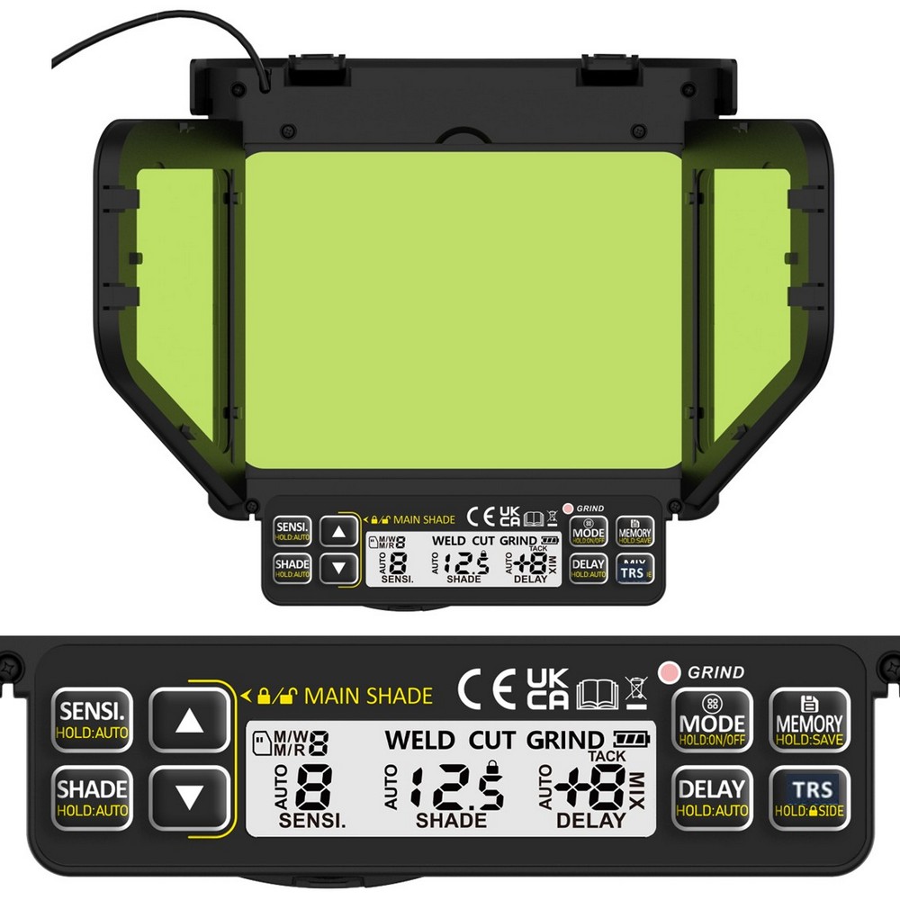 Il filtro panoramico consente di controllare con grande precisione il cordone e i dettagli del pezzo, riducendo il rischio di errori e migliorando la qualità del risultato. I parametri di base del filtro si impostano in modo intuitivo tramite il pannello di controllo LCD, mentre i comandi esterni permettono una regolazione rapida: cambio delle modalità operative, selezione della modalità GRIND (smerigliatura), regolazione del livello di oscuramento, attivazione della funzione AUTO SHADE e salvataggio delle impostazioni preferite.