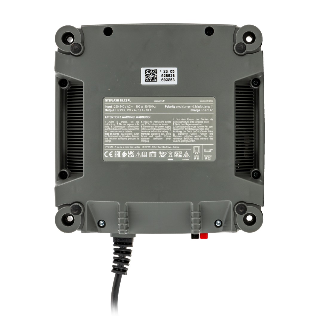 GYSFLASH 18.12 PL è un caricabatterie smart 12V di nuova generazione, progettato per ricaricare e mantenere batterie Piombo (incluso Start & Stop EFB/AGM) e Lithium Iron Phosphate (LiFePO4) installate su auto, veicoli commerciali, camper e veicoli premium. Con una potenza di 18A e ciclo di lavoro al 100% a 40 °C, garantisce una ricarica rapida e controllata, adatta a contesti professionali e intensivi.
