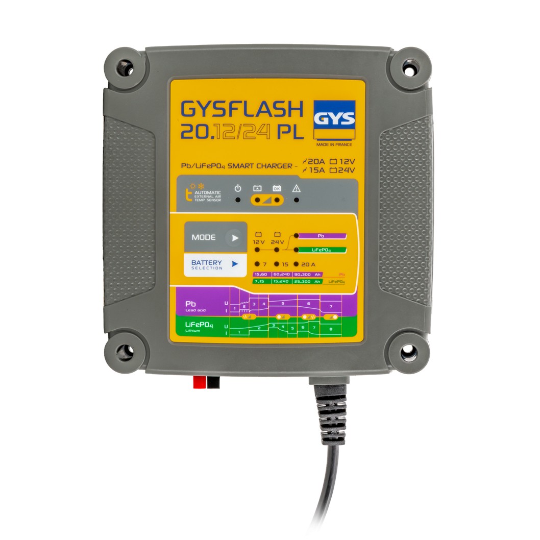 GYSFLASH 20.12/24 PL è un caricabatterie smart 12/24V da 20A progettato per ricaricare e mantenere batterie Piombo e LiFePO4 su auto, veicoli commerciali, mezzi industriali leggeri e veicoli agricoli. Grazie alla tecnologia ad alta frequenza e alla gestione IU0U in più step, offre una ricarica stabile e controllata, adatta a utilizzi intensivi.