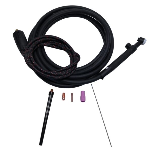 Torcia TIG con rubinetto gas, 110A-35% DC, 95A-35% AC, cavo 4m, connettore 25mm e tubo gas 2m. Raffreddamento in aria.