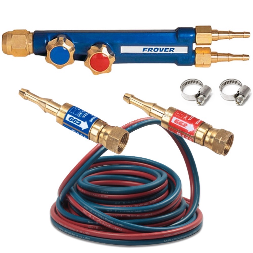 KIT completo di impugnatura cannello, valvole di sicurezza con portagomma, tubo binato ossigeno / acetilene.