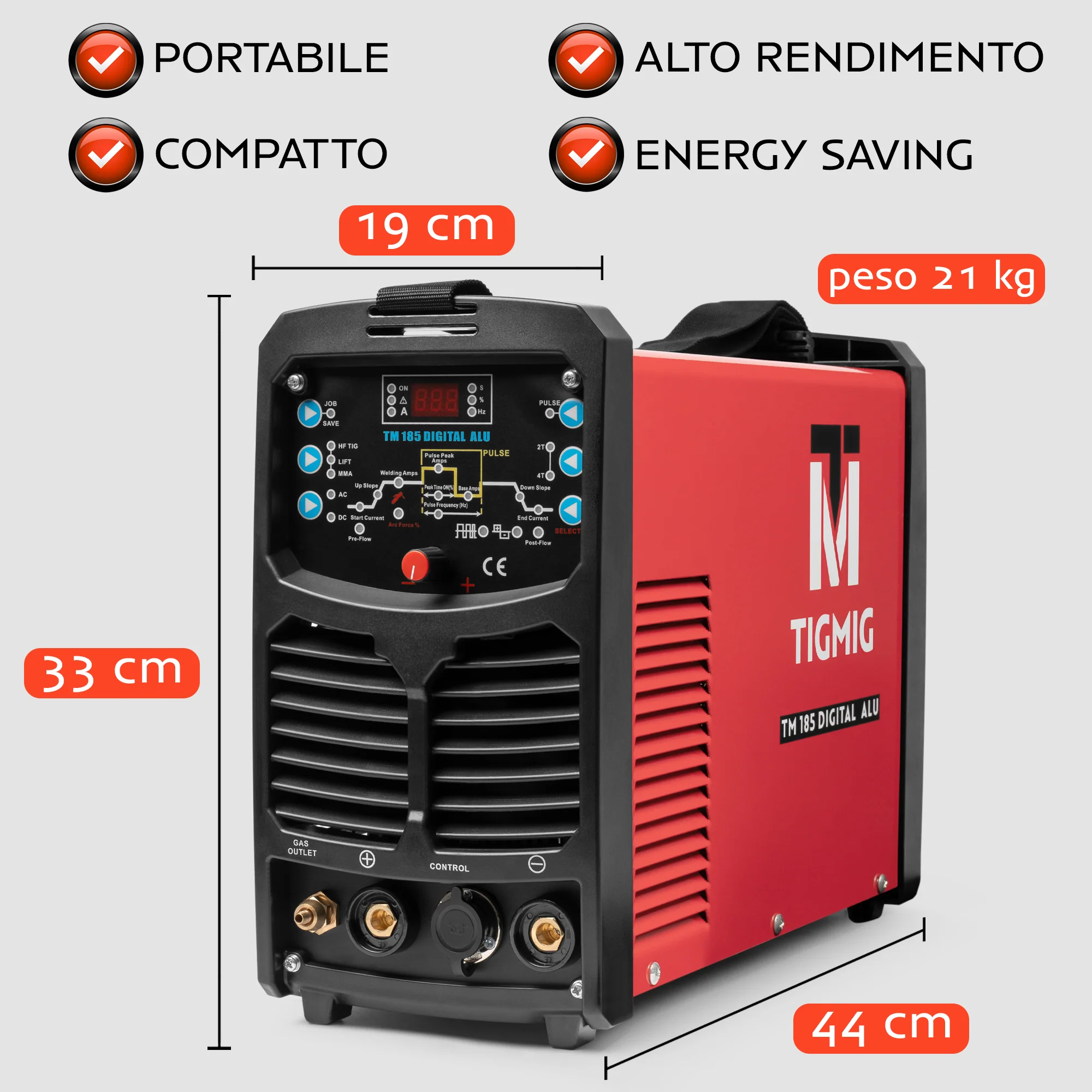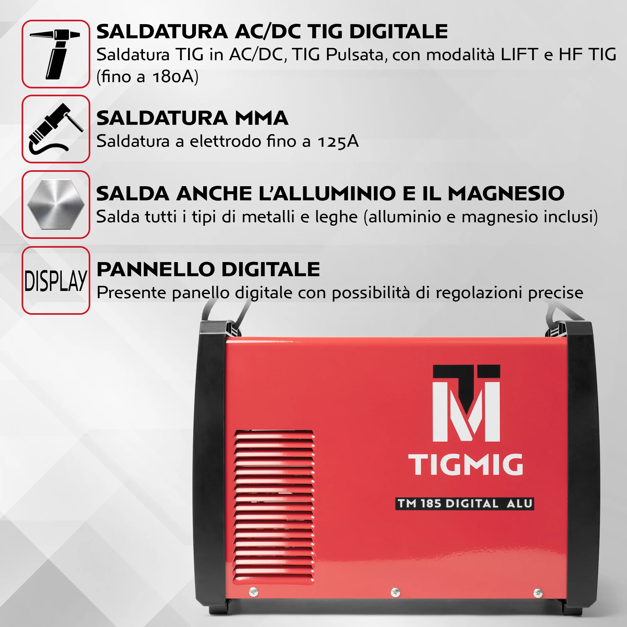 La saldatrice TIGMIG TM 185 DIGITAL ALU è un inverter TIG AC/DC pulsata da 180A, adatta alla saldatura di tutti i metalli e leghe, inclusi alluminio e magnesio, con funzione MMA per l’utilizzo ad elettrodo.
