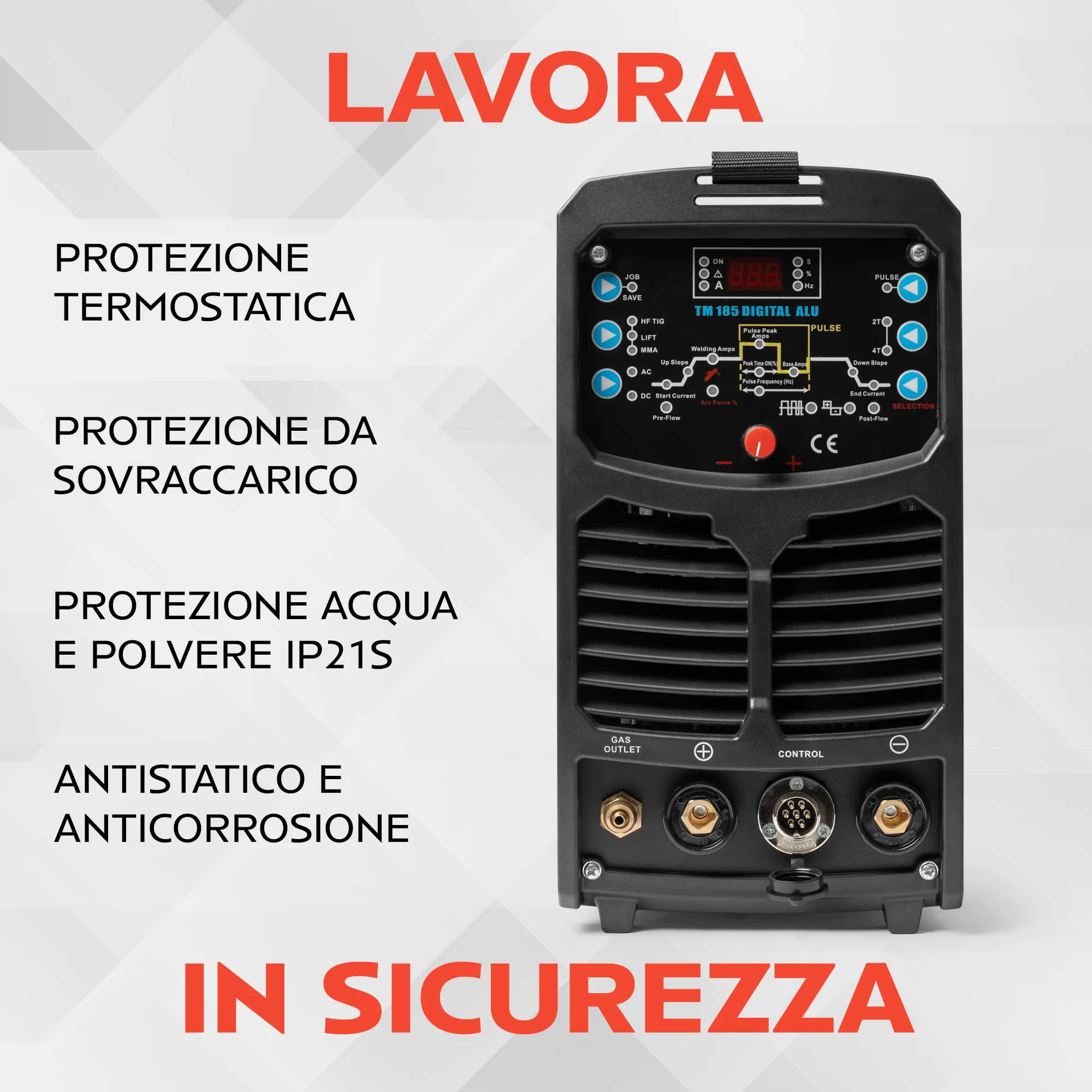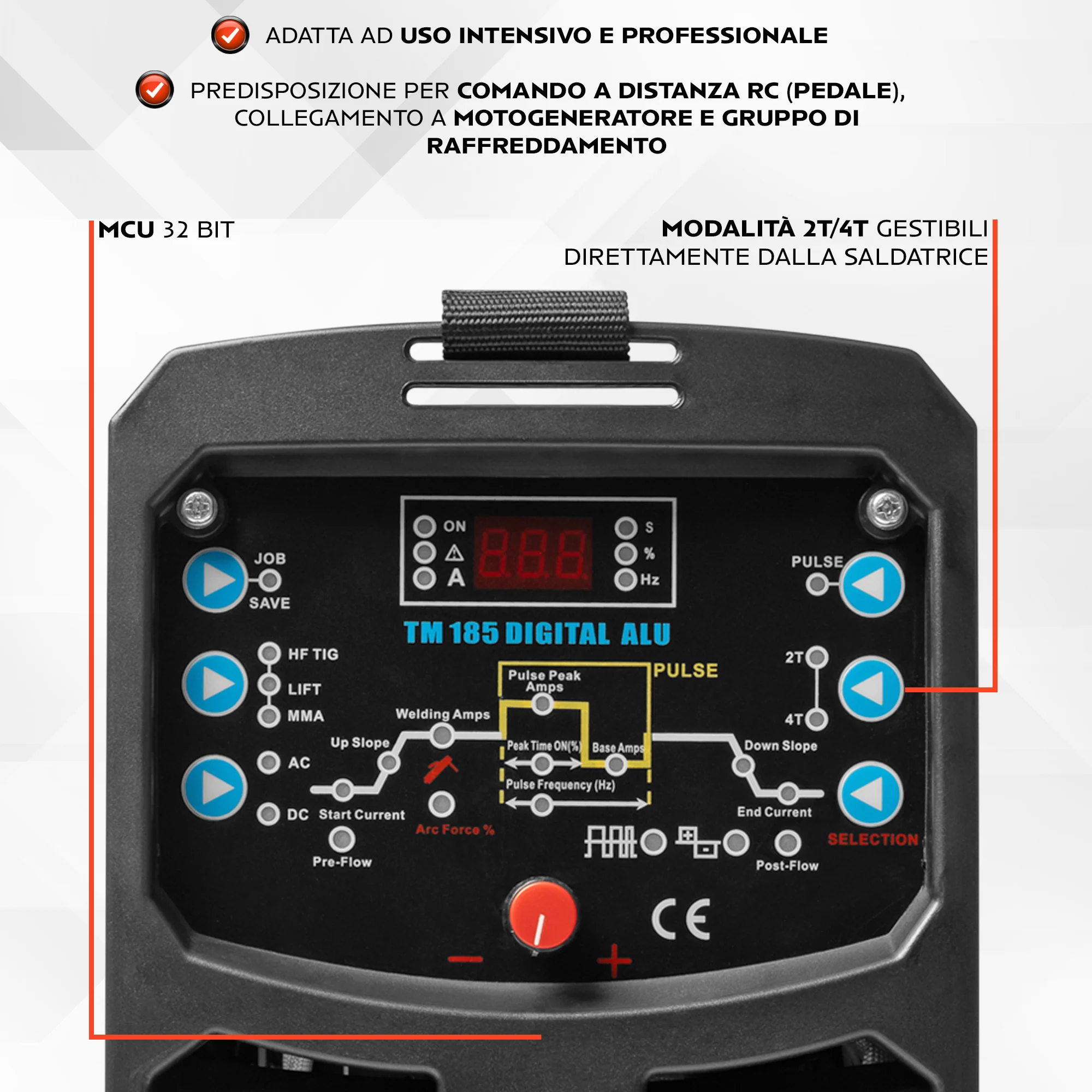 Funzione pulsata TIG con due modalità (Low e High) per regolare frequenza e ampiezza dell’arco e miglior controllo del bagno.
